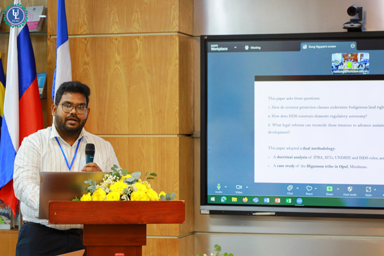 Tiếp đó, Trợ lý Giáo sư G. Mahith Vidyasagar – Khoa Luật, Viện Khoa học và Công nghệ SRM, Chennai, Ấn Độ cũng đã trình bày bài tham luận “Reconciling International Investment Law with Indigenous Land Rights: A Philippine Perspective on Sustainable Development in ASEAN”. Bài tham luận chỉ ra rằng Philippines đang đối mặt với thách thức trong việc cân bằng giữa thu hút đầu tư nước ngoài và bảo vệ quyền sử dụng đất truyền thống của các cộng đồng bản địa - một yếu tố then chốt của phát triển bền vững. Qua đó, bài tham luận đánh giá sâu mối tương tác giữa nghĩa vụ đầu tư quốc tế của Philippines và cam kết bảo vệ quyền đất đai của người bản địa trong nước, đặc biệt là thông qua cơ chế giải quyết tranh chấp giữa nhà đầu tư và nhà nước (ISDS). Cơ chế này có thể làm suy giảm quyền điều chỉnh của nhà nước và cản trở việc thực thi hiệu quả quyền bản địa. Từ đó, bài viết đưa ra các kiến nghị cải cách pháp lý, bao gồm: Lồng ghép rõ ràng quyền của người bản địa trong nội dung các hiệp định đầu tư; tăng cường sự tham gia của cộng đồng bản địa trong quá trình đàm phán đầu tư; củng cố các cơ chế bảo vệ pháp lý trong nước, đảm bảo rằng các dự án phát triển phù hợp với nguyên tắc phát triển bền vững.