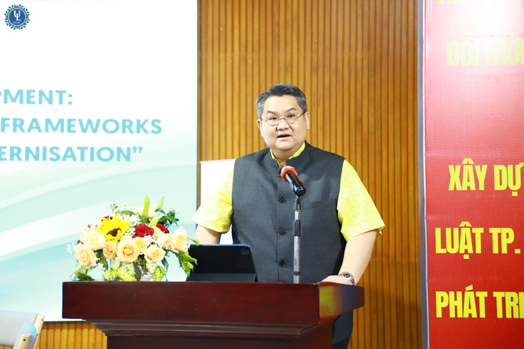 Hội thảo lần này ghi nhận sự hiện diện và đóng góp học thuật nổi bật từ đoàn đại biểu Khoa Luật – Đại học Chiang Mai (Thái Lan), đối tác chiến lược lâu năm của Trường Đại học Luật TP. Hồ Chí Minh trong lĩnh vực đào tạo và nghiên cứu pháp luật khu vực. Đoàn đại biểu do PGS.TS. Chainarong Luengvilai – Trưởng Khoa Luật làm trưởng đoàn, cùng sự tham gia của nhiều học giả giàu kinh nghiệm như: PGS.TS. Kitpatchara Somanawat – Phó Trưởng khoa Luật, PGS.TS. Usanee – chuyên gia về luật năng lượng và môi trường, TS. Watis Sothibhandu – chuyên gia luật quốc tế công, TS. Jaruwan Maneesook – chuyên gia về luật nông nghiệp bền vững và quyền tiếp cận tài nguyên, TS. Korawad Sawaengsuksant – chuyên gia về luật công nghệ và pháp luật dữ liệu, và TS. Pacharaphol Apithyagatha – chuyên gia luật cạnh tranh và các hiệp định thương mại tự do.